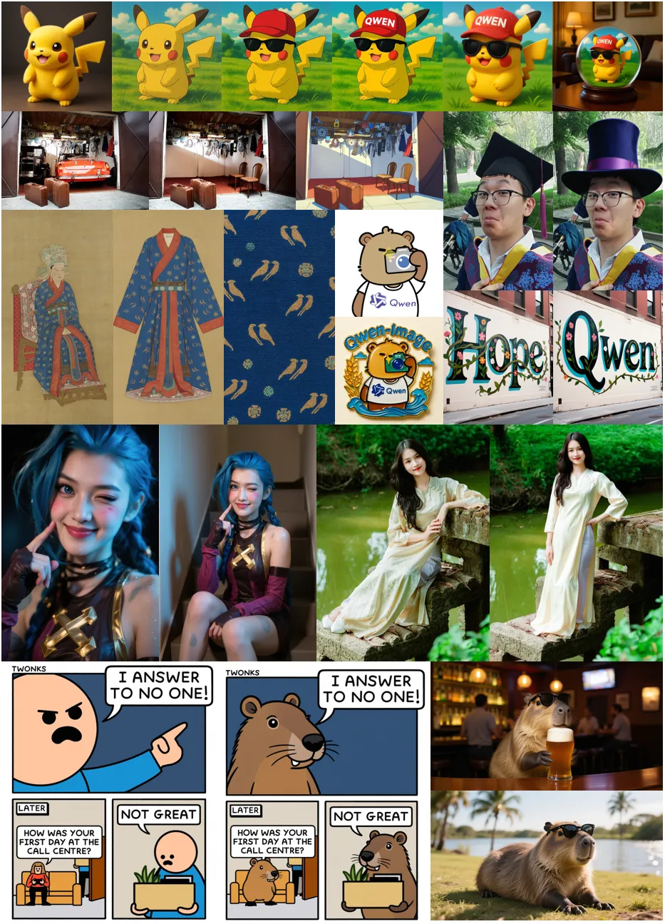 文本渲染能力之外,Qwen-Image还具备一致性图像编辑能力,支持风格迁移、增删改、细节增强、文字编辑、人物姿态调整等多种操作。