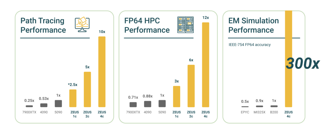 在路径追踪(Path Tracing)、FP64高性能计算(HPC)和电磁(EM)仿真等需要大量计算资源的复杂任务中,Zeus GPU表现强势,性能远超市面上的其他显卡。