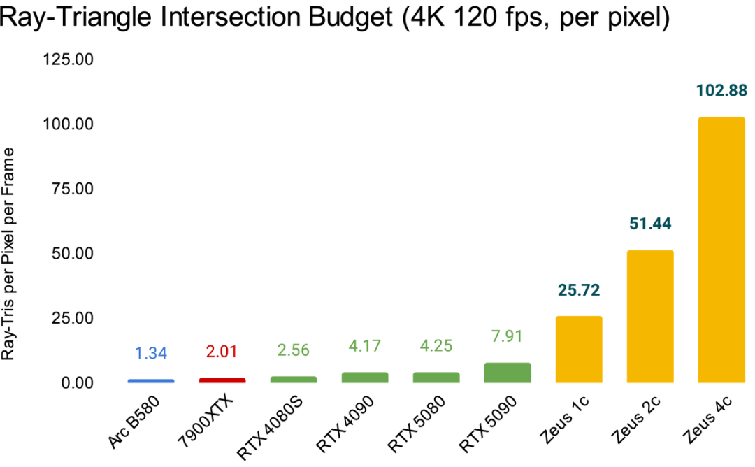 例如像我们开头提到的,在处理4K分辨率每秒120帧的路径追踪任务时,Zeus 4C的性能是RTX 5090的13倍。