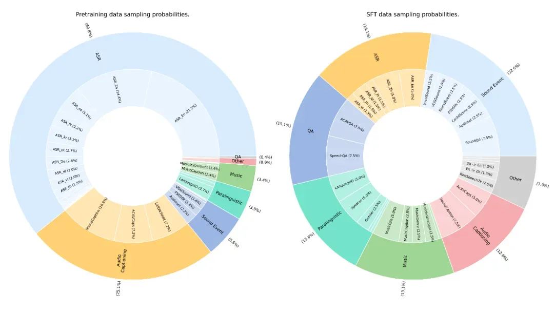 不同于 Qwen2.5-Omni 等未公开训练数据细节的模型,MiDashengLM 完整公开了 77 个数据源的详细配比,技术报告中详细介绍了从音频编码器预训练到指令微调的全流程。