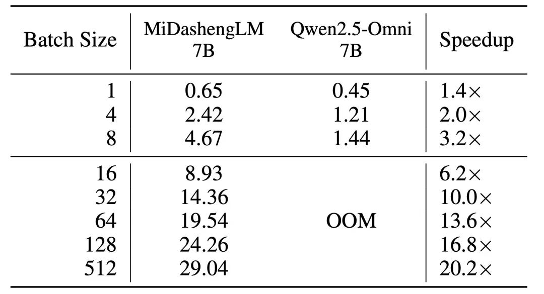 而当批次处理时,MiDashengLM的优势更加明显,在80GB GPU上处理30秒音频并生成100 个 token的测试中,MiDashengLM可以把batch size设置为512,而 Qwen2.5-omni-7B 在 batch size 设置为16时即出现显存溢出(OOM)。