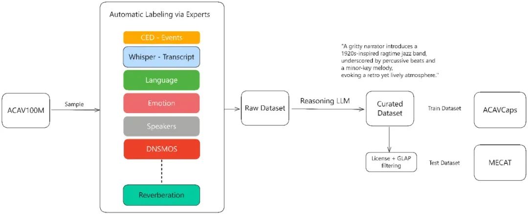 MiDashengLM的训练数据通过多专家分析管道生成。首先对原始音频使用各种专家模型作语音、人声、音乐和环境声学的细粒度标注,包括使用Dasheng-CED模型预测2秒粒度的声音事件,再通过DeepSeek-R1推理大模型合成统一描述。