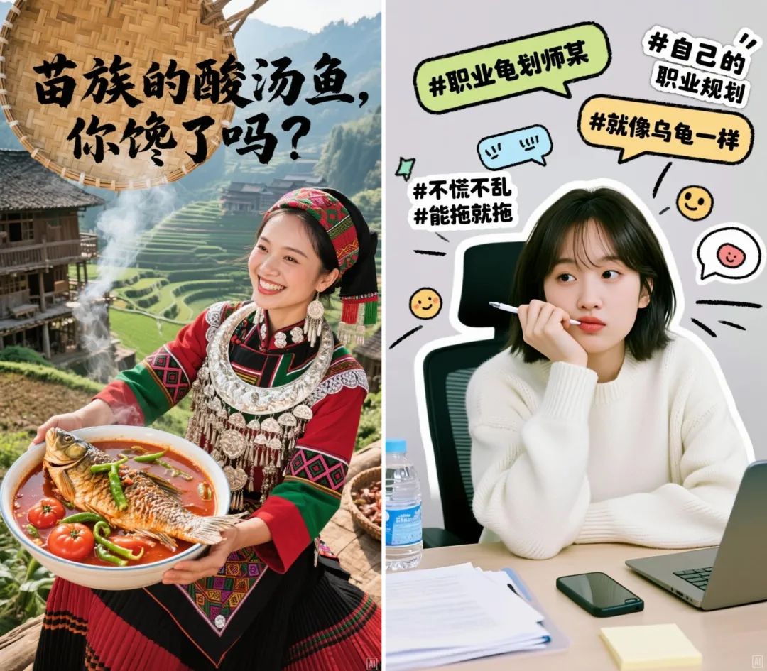 我们浅浅用它设计了民族风海报、涂鸦式打工人表情包,交付成品相对不错,过去最容易“翻车”的图文排版、文字错乱问题,也几乎挑不出毛病了。