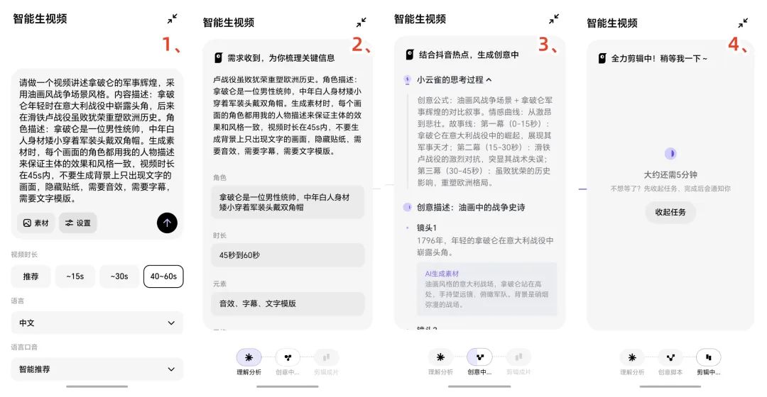 小云雀会先根据提示词做一番理解分析,根据用户的创作想法进行角色设计,完善脚本要求、视频风格、目标受众,归纳视频主题和语言,特别值得一提的是,过程中小云雀还会主动学习抖音热门视频,总结爆款内容的节奏特点,将用户创意用详细的分镜脚本表现出来。