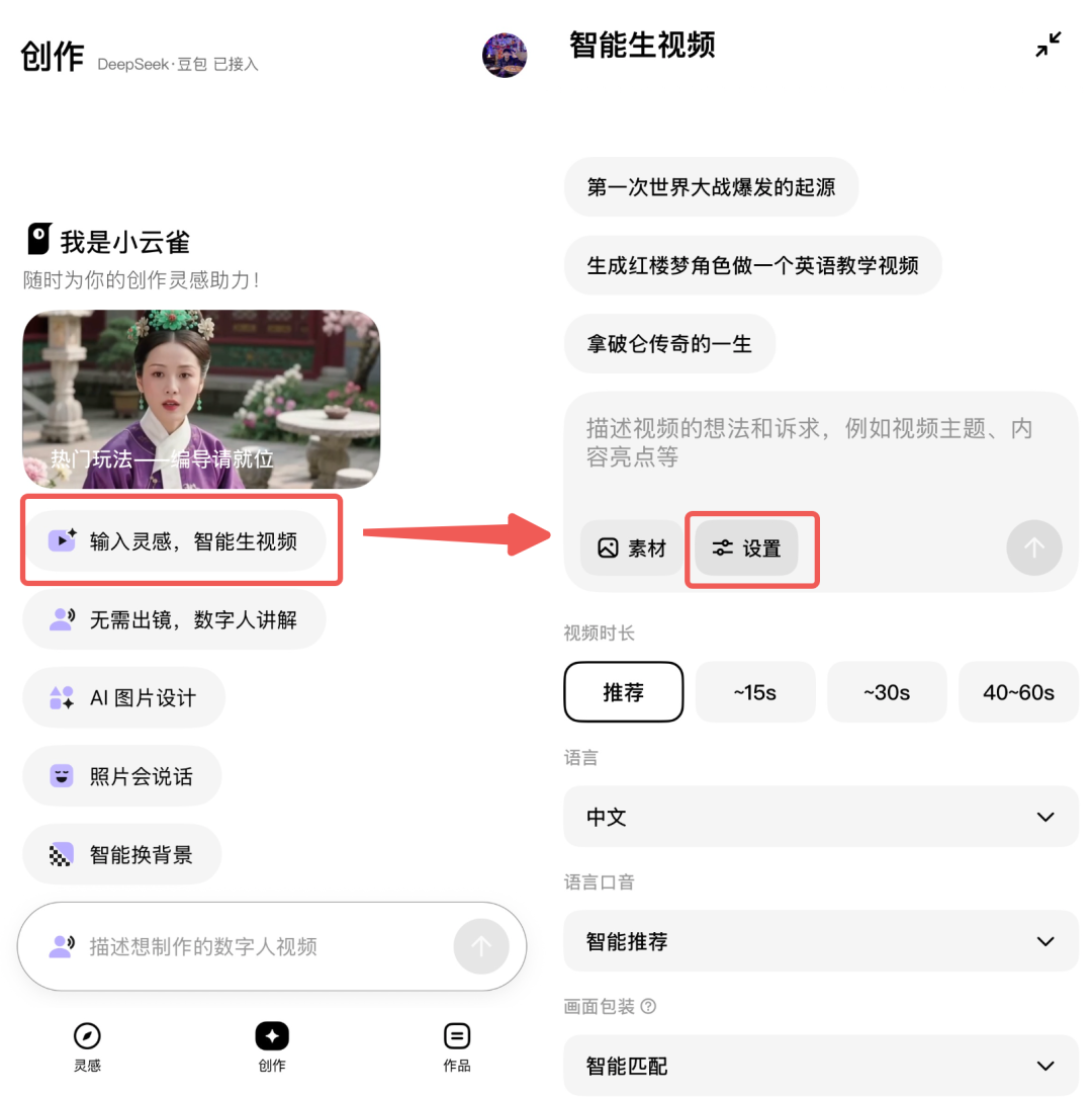 进入小云雀APP之后,选择“智能生视频”,即可进入Prompt输入界面;在这里你还可以设置视频的一些细节内容。