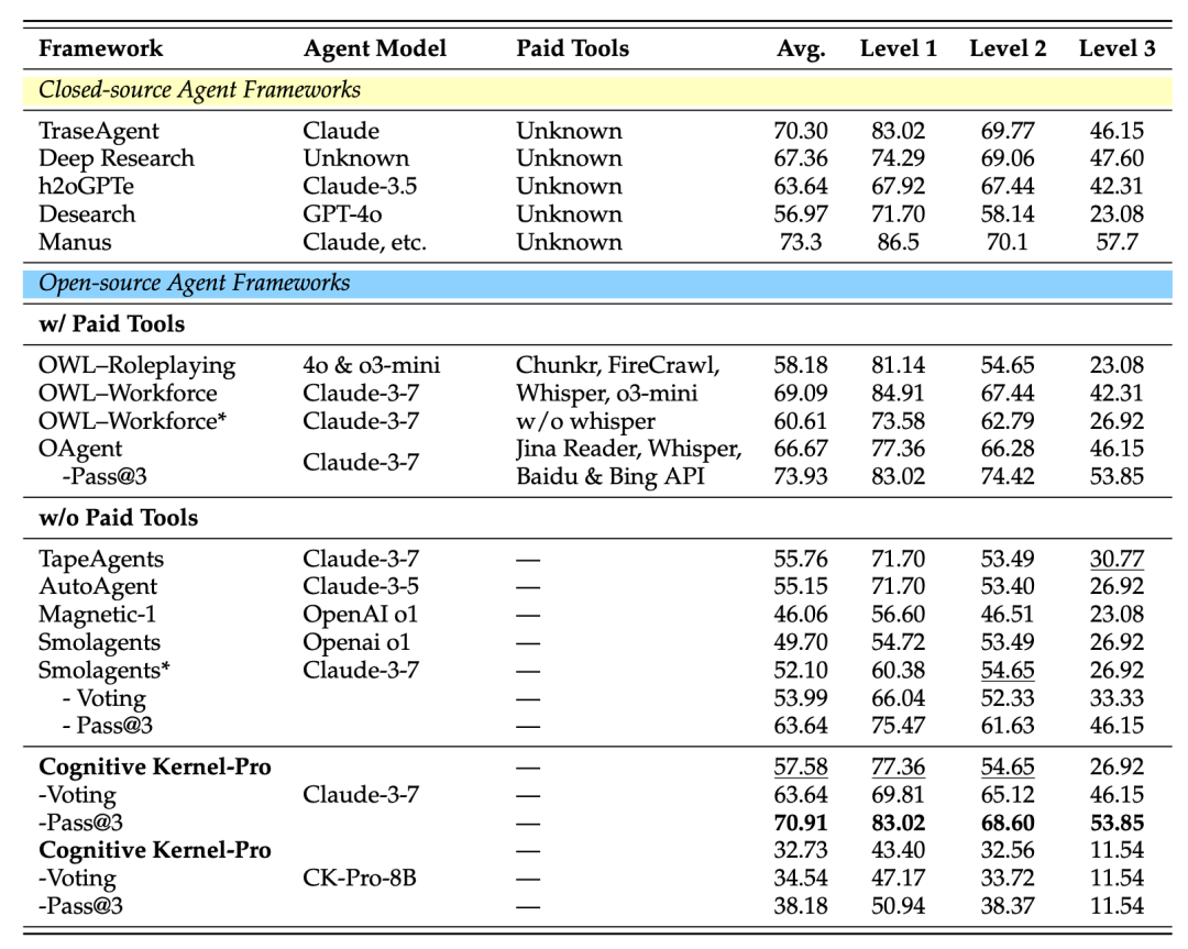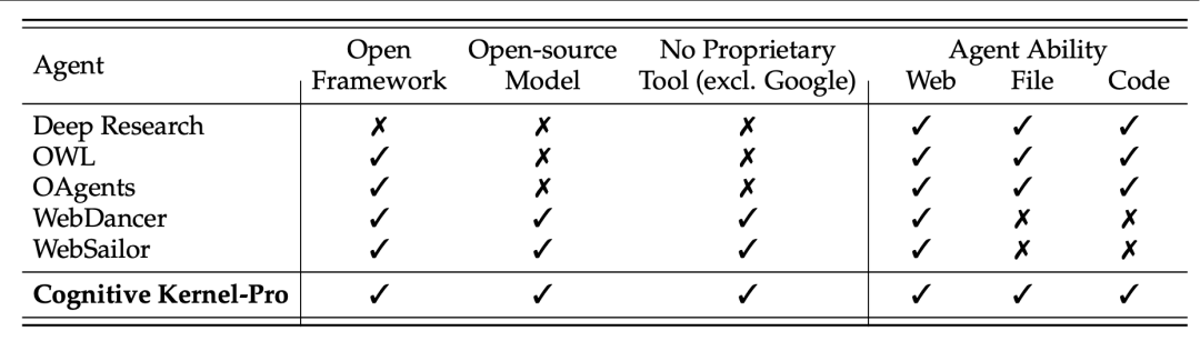 上图的技术报告中对比了多个AI智能体框架,显示Cognitive Kernel-Pro在功能全面性和开源程度上具有显著优势。框架支持灵活切换免费API(如DuckDuckGo),进一步提升了可访问性。