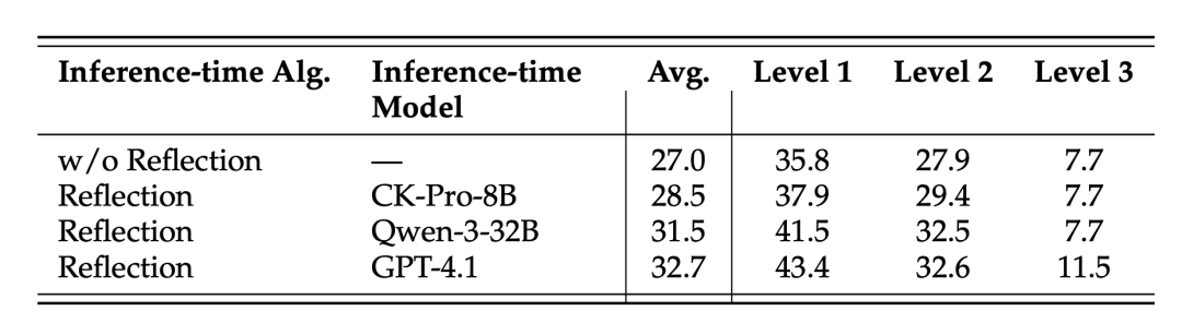 更强的模型,例如GPT-4.1,可以提供更好的反思信号,但开源模型例如Qwen-3-32B已经能提供相当GPT-4.1的反思效果。