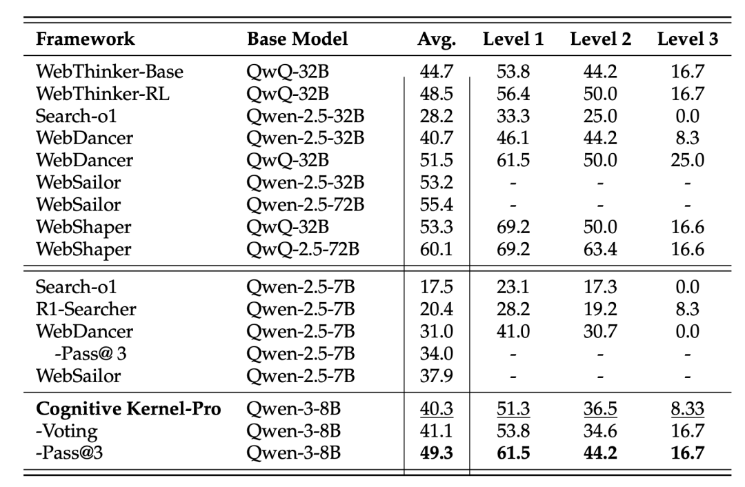 上表展示了Cognitive Kernel-Pro与其他开源 Agent基础模型的性能对比。