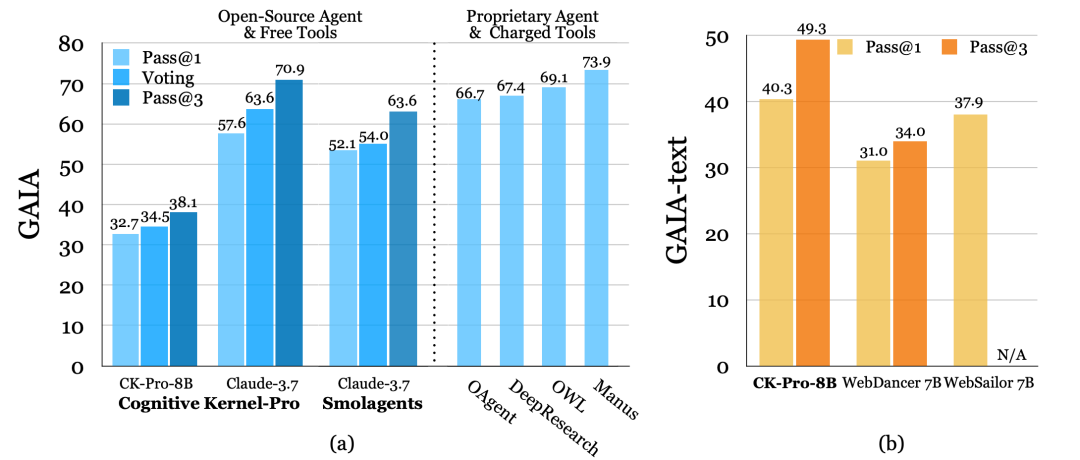 在GAIA基准全集上,Cognitive Kernel-Pro超越开源免费框架SmolAgents,性能逼近依赖付费工具的智能体,展现出卓越的综合能力。在GAIA-text上,训练的8B模型超越WebDancer和WebSailor-7B。
