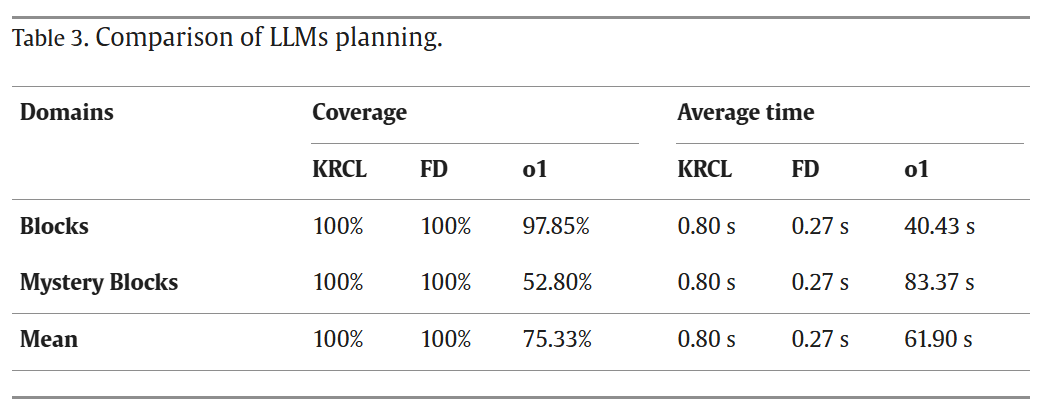 此外,团队还在PlanBench(用于评估大语言模型规划性能的基准数据集)上对KRCL与大型语言模型OpenAI o1在规划任务中的性能进行了对比。