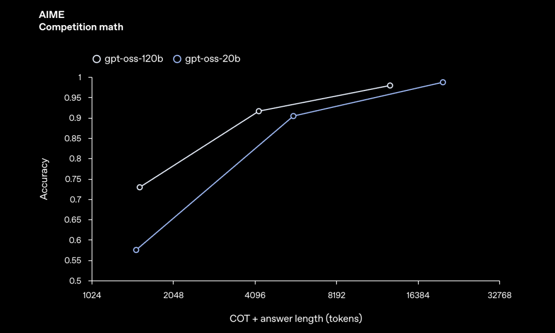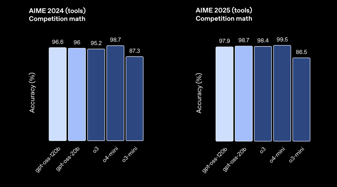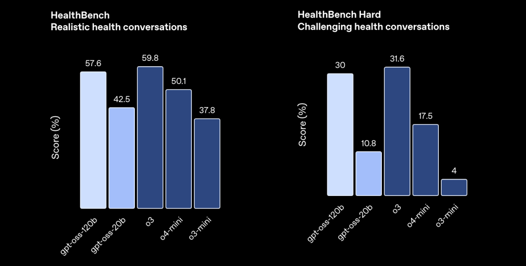 在健康相关问答(HealthBench)和竞赛数学(AIME 2024 与 2025)上,gpt-oss-120b的表现甚至超越了o4-mini。