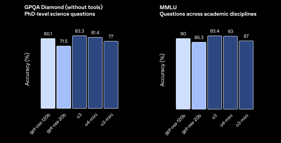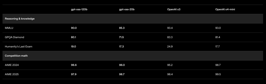 从性能角度来看,gpt-oss已经达到了开源模型里推理性能的第一梯队,但在代码生成和复杂推理任务中仍略逊于闭源模型(如GPT-o3和o4-mini)。