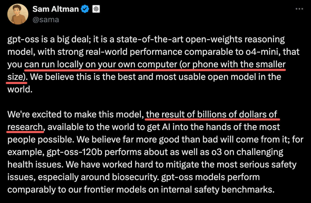 可以在本地笔记本(20b的可以在手机上)运行;耗资数十亿美元的研究成果。