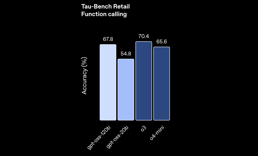 整体来看,这两个模型在工具使用、少样本函数调用、链式思考推理(如Tau-Bench智能评估套件的结果所示)以及HealthBench上表现强劲,甚至超越了包括OpenAI o1和GPT‑4o在内的专有模型。