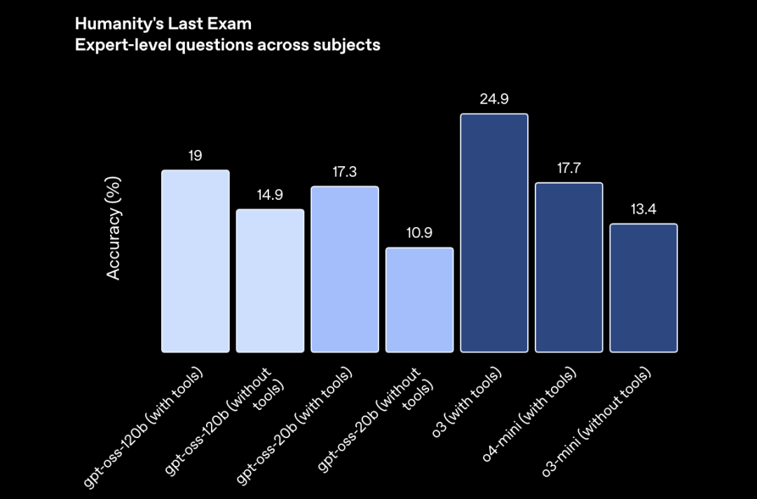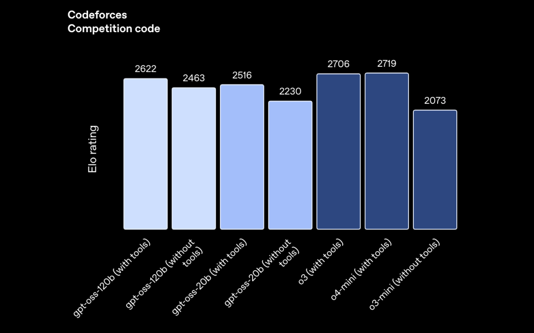 在竞赛编程(Codeforces)、通用问题解决(MMLU和HLE)以及工具调用(TauBench)方面,gpt-oss-120b的表现优于OpenAI的o3-mini,并达到或超过了o4-mini的水平。