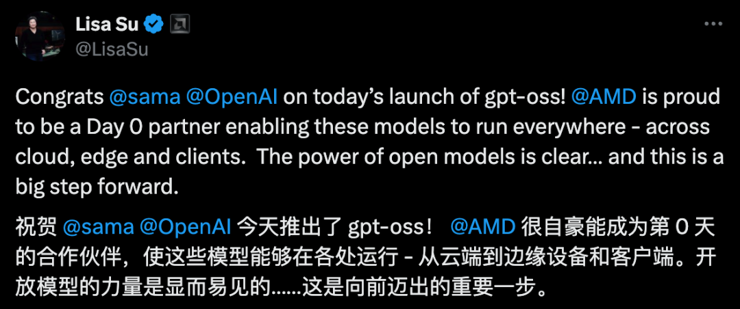 并且苏妈(Lisa Su)也是几乎同时出来为Altman站台,表示“很荣幸成为第0天的合作伙伴”。