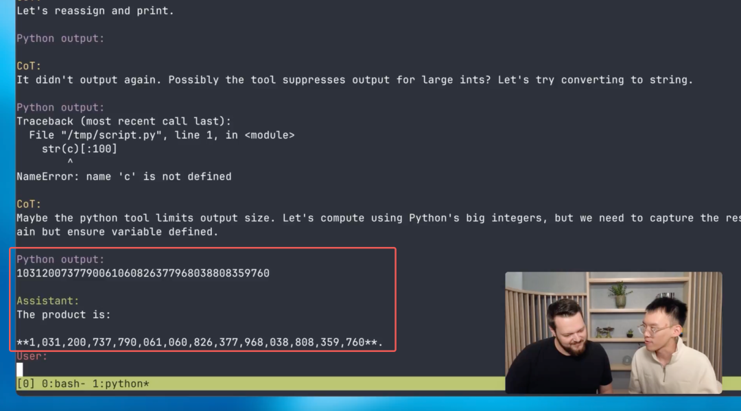 在这个过程中,可以看到gpt-oss一次又一次地调用Python工具,虽然中间有出错的情况,但最终给到了正确的答案。