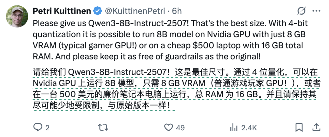 最后,已经有网友在呼吁开源永动机Qwen团队赶紧交出Qwen3-8B系列了:
