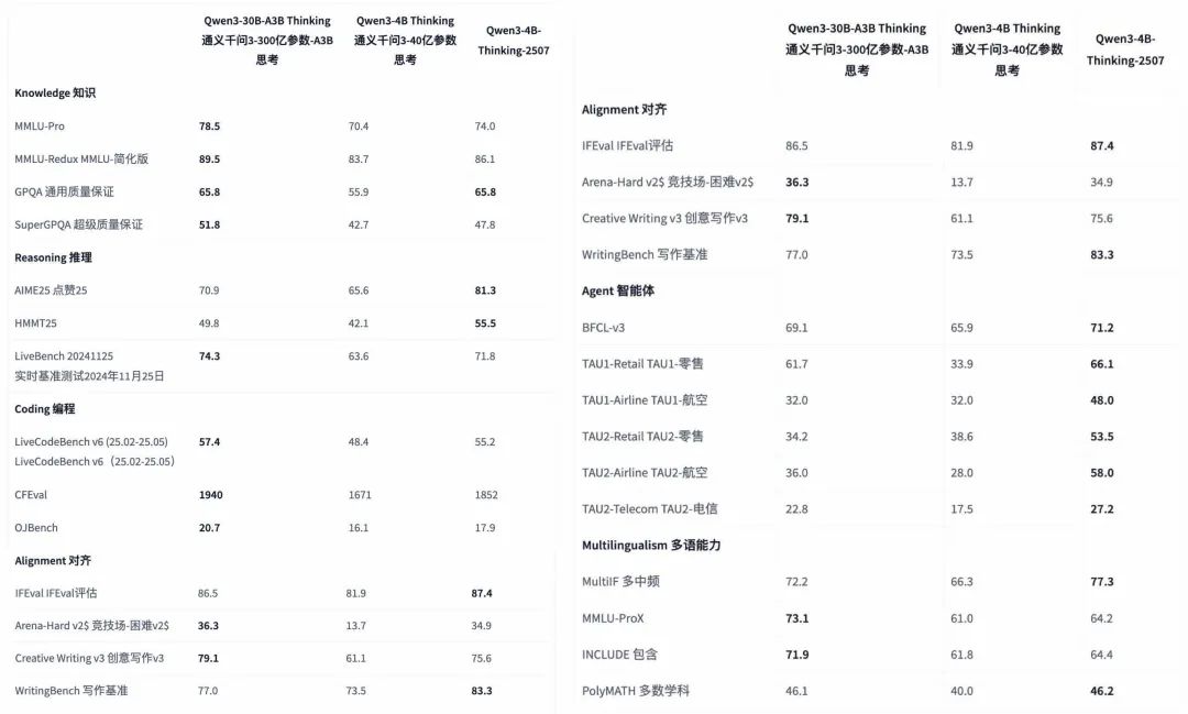 现在同样在多个测试集上可以看到,Qwen3-4B-Instruct-2507和Qwen3-4B-Thinking-2507对于前作都有非常明显的能力提升。