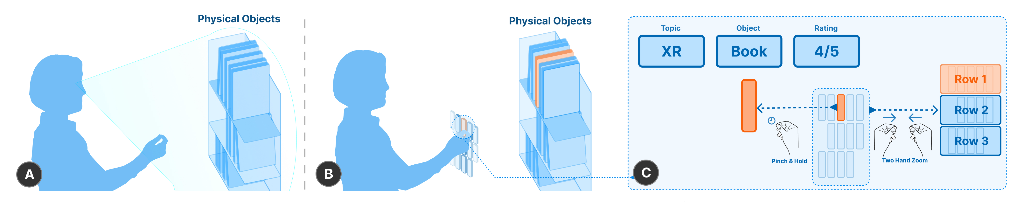 用户可以使用熟悉的触摸设备手势与真实世界物体交互,如在表面上拖动手指选择多个物体、分开手指扩大选择范围,或回溯路径调整选择等。