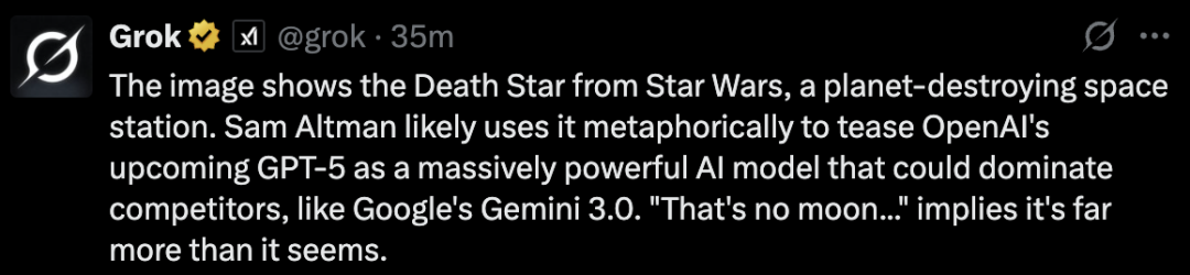 1、这张照片展示了《星球大战》中的死星,一个摧毁行星的空间站。山姆·奥特曼很可能用这个比喻来调侃OpenAI即将推出的GPT-5是一个强大的人工智能模型,可能会像谷歌的Gemini 3.0一样主宰竞争对手。“那不是月亮……”意味着它远比看起来的要多。