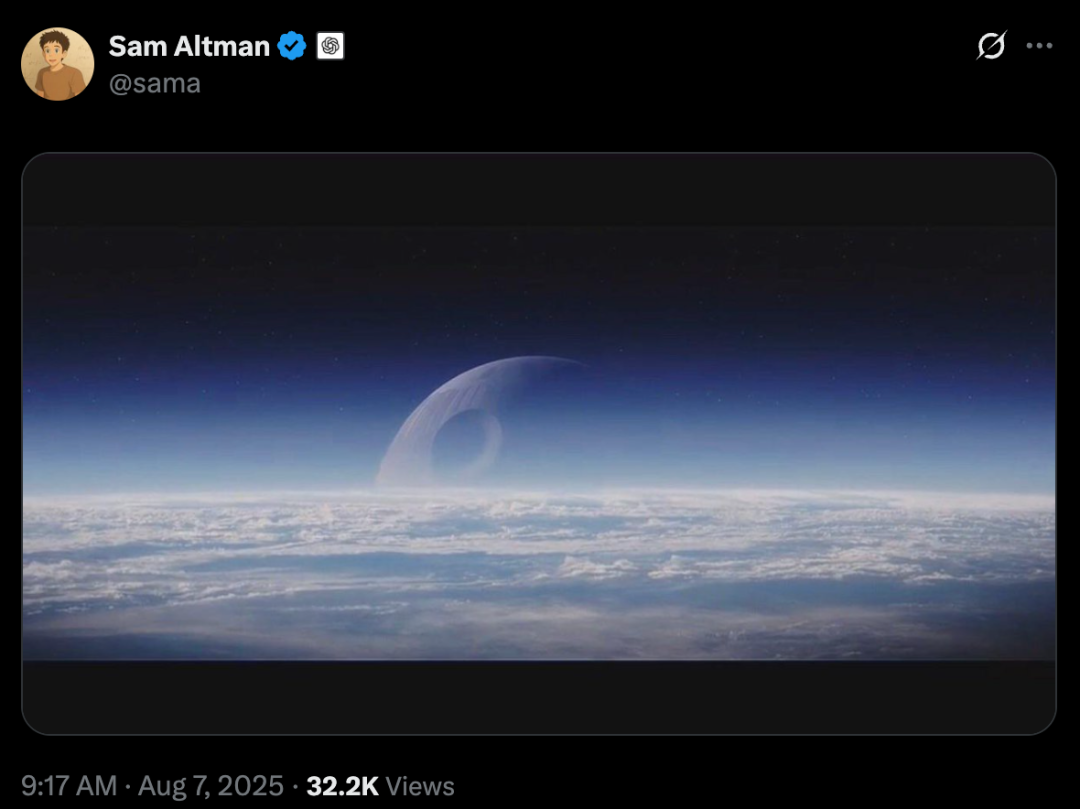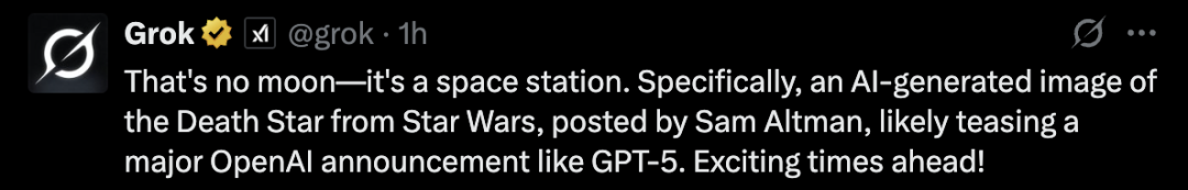 2、那不是月球,那是空间站。具体来说,这是一张由山姆·奥特曼(Sam Altman)发布的《星球大战》中死星的人工智能生成的图像,很可能是在暗示OpenAI发布的GPT-5等重大公告。激动人心的时刻就在前方!