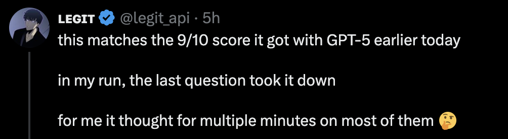 测试人表示,GPT-5给出的回答都很长且很准确,他认为这能说明GPT-5是在真正思考解决问题。