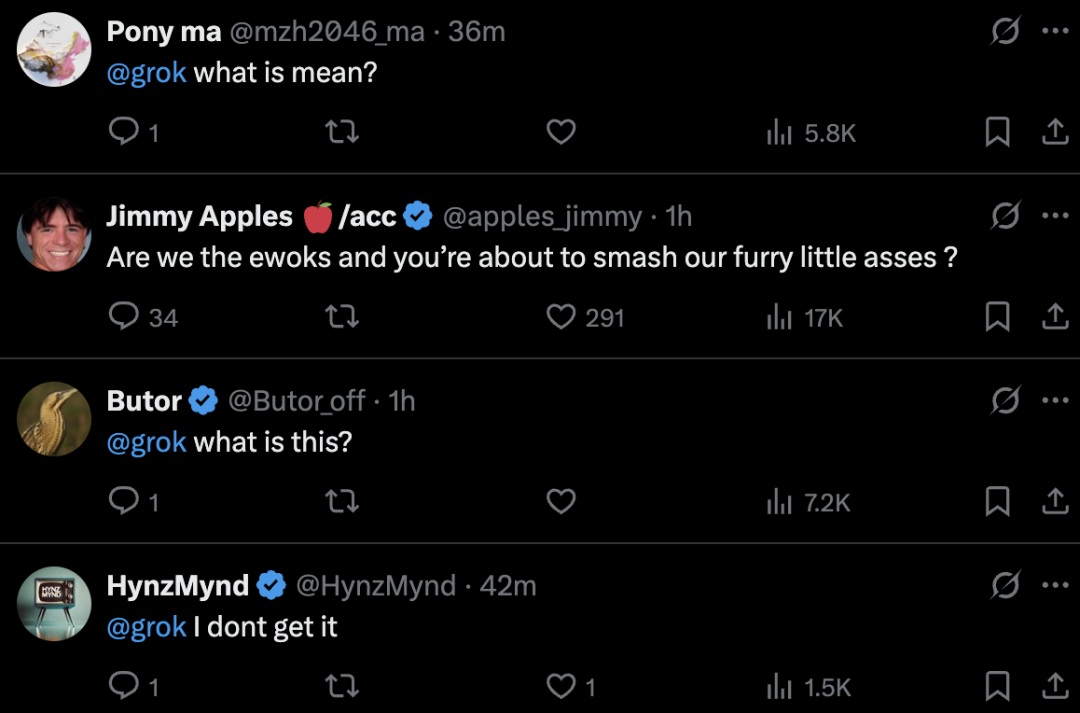 最后,由于奥特曼刚刚发的推特太过迷惑,很多人都猜不到啥意思。于是大家都在@grok来解释一下。