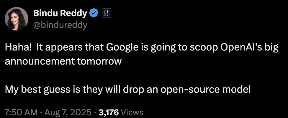 种种迹象来看,北京时间8月8日凌晨1点的OpenAI线上发布,不出意外应该大概可能就是GPT-5了,大家可以期待一下。