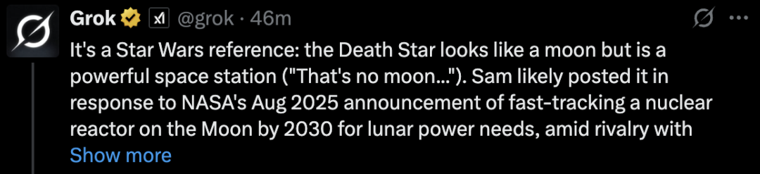 3、这引用了《星球大战》:死星看起来像月球,但却是一个强大的空间站(“那不是月球……”)。美国宇航局于2025年8月宣布,到2030年将在月球上快速建造一座核反应堆,以满足月球的电力需求。
