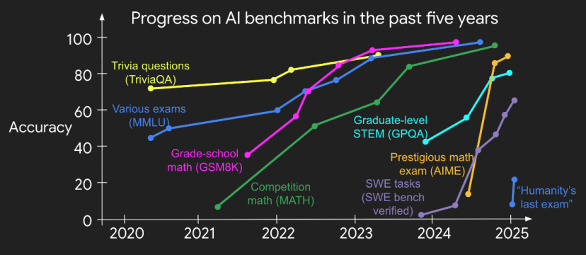 △图片来自Openai前研究员Jason Wei,高难度数据集正在迅速被模型们“吞噬殆尽”