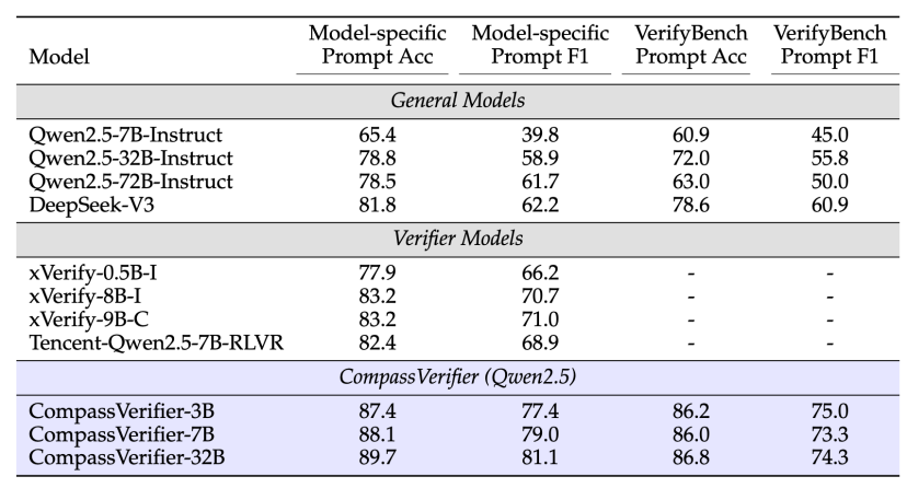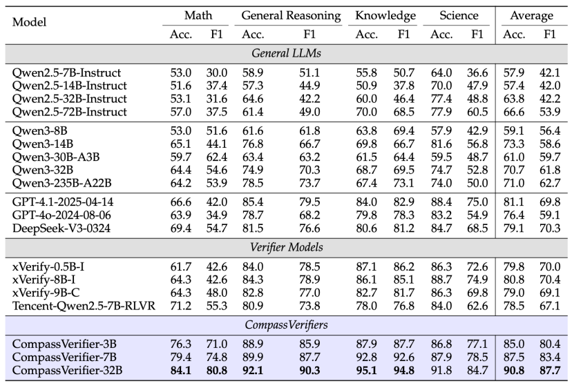 在VerifierBench上,CompassVerifier-32B(Based Qwen2.5) 的平均准确率达到90.8%,F1分数87.7%,超过DeepSeek-V3和GPT-4等大尺寸模型。