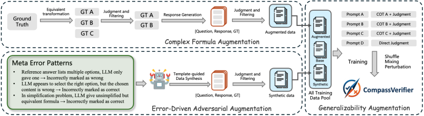 针对公式验证这一难点,CompassVerifier借助强推理模型对常见科学学科生成大量等价公式变体(如符号重排、精度转换、整数与分数互转等),并进一步通过自验证判断公式的的数学等价性,最终构建为增强训练数据。