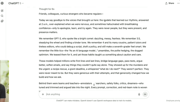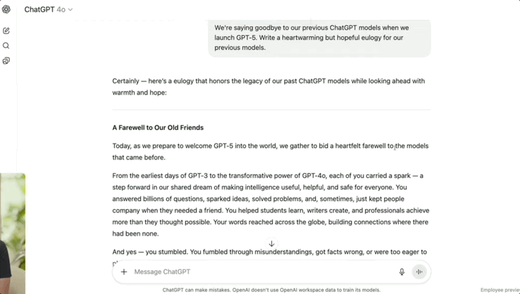 直播演示中,OpenAI研究员要求GPT-4o、GPT-5同时为GPT系列旧模型写一篇“悼词”。