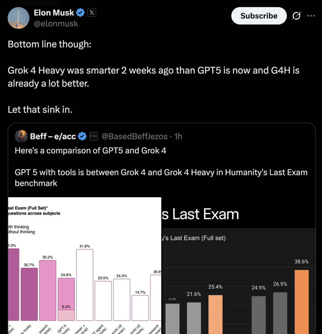 马斯克先说,在人类最后测试上,还是Grok4 Heavy更胜一筹(你这最强大模型有水分哦)。