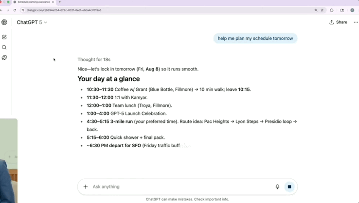 记忆能力也进一步提升,支持链接外部服务,比如Gmail、谷歌日历等。看到日程后GPT-5可以自动进行一些助理级工作,比如发现未回复的邮件等。