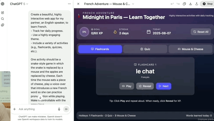 在展示中,研究员让GPT-5构建一个“学法语”的APP,允许自定义词汇、修改界面设计。