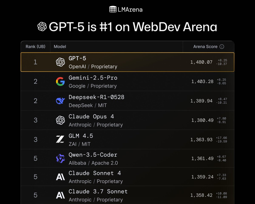 在网页开发中,GPT-5创造新纪录,超越Gemini-2.5-pro和Claude-Opus-4。