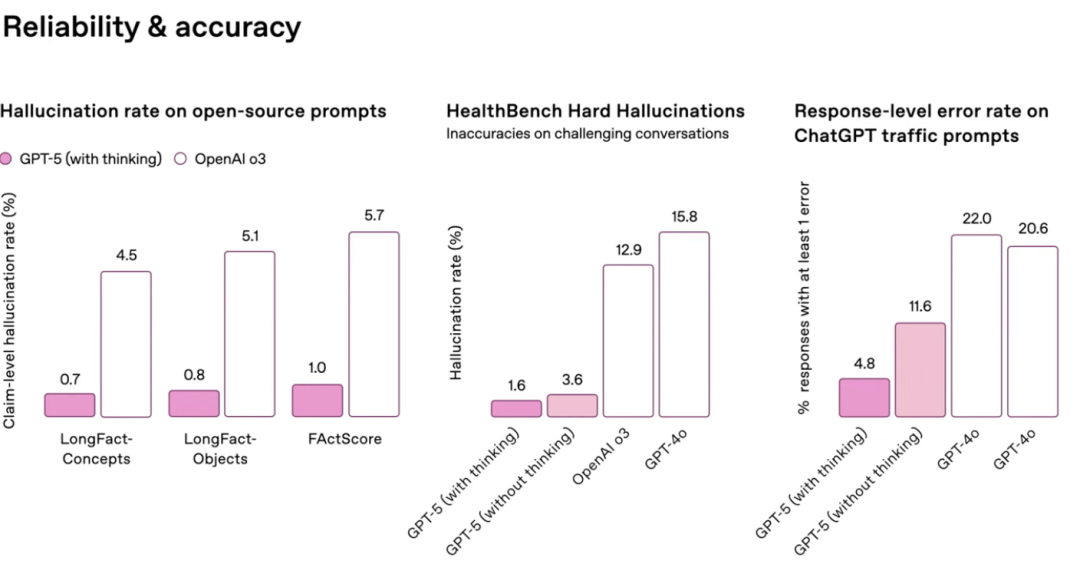 同时在可靠性和精准性上,GPT-5的提升也相当明显。