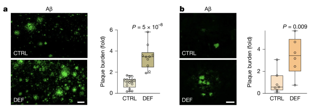 结果显示,在锂缺乏饮食下维持的3xTg和J20小鼠在海马体中Aβ沉积显著增加(图a,b)。在锂缺乏饮食五周后,观察到淀粉样斑块负荷增加,并且随着长期治疗持续增加。