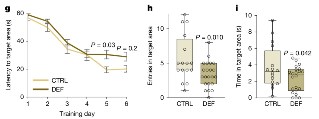 通过Morris水迷宫实验发现,对3xTg小鼠施用缺锂饮食显著损害了学习能力(图g)和长期记忆(图h,i)。
