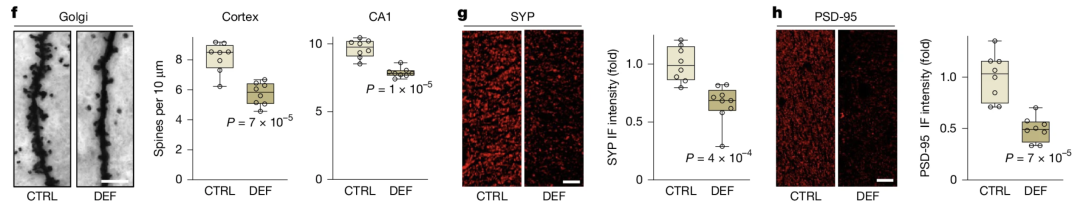 在锂缺乏的3xTg和野生型小鼠中通过戈尔吉染色检测到树突棘的丢失(图f),同时突触前和突触后蛋白突触蛋白和PSD-95的免疫标记减少(图g,h)。