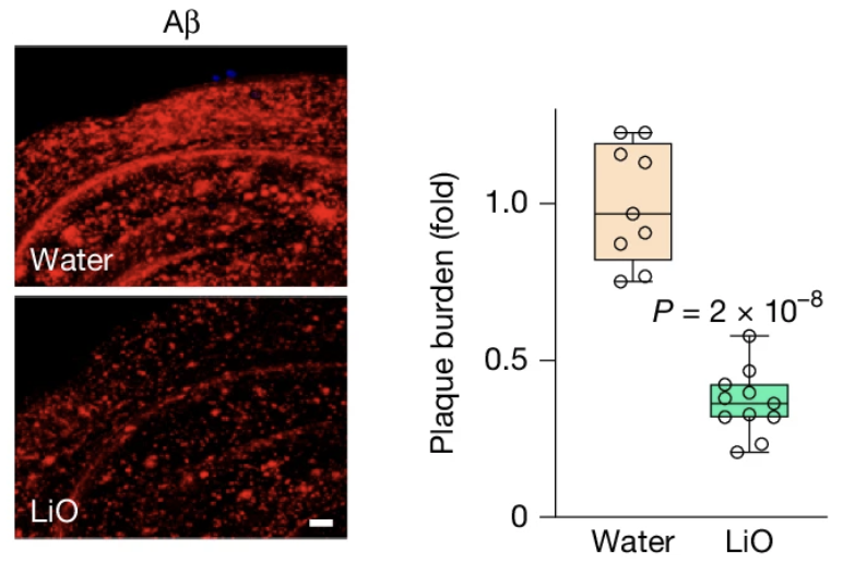 在Aβ沉积广泛存在的高龄J20小鼠中,LiO也能使Aβ斑块负荷降低约70%。