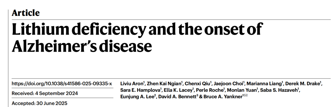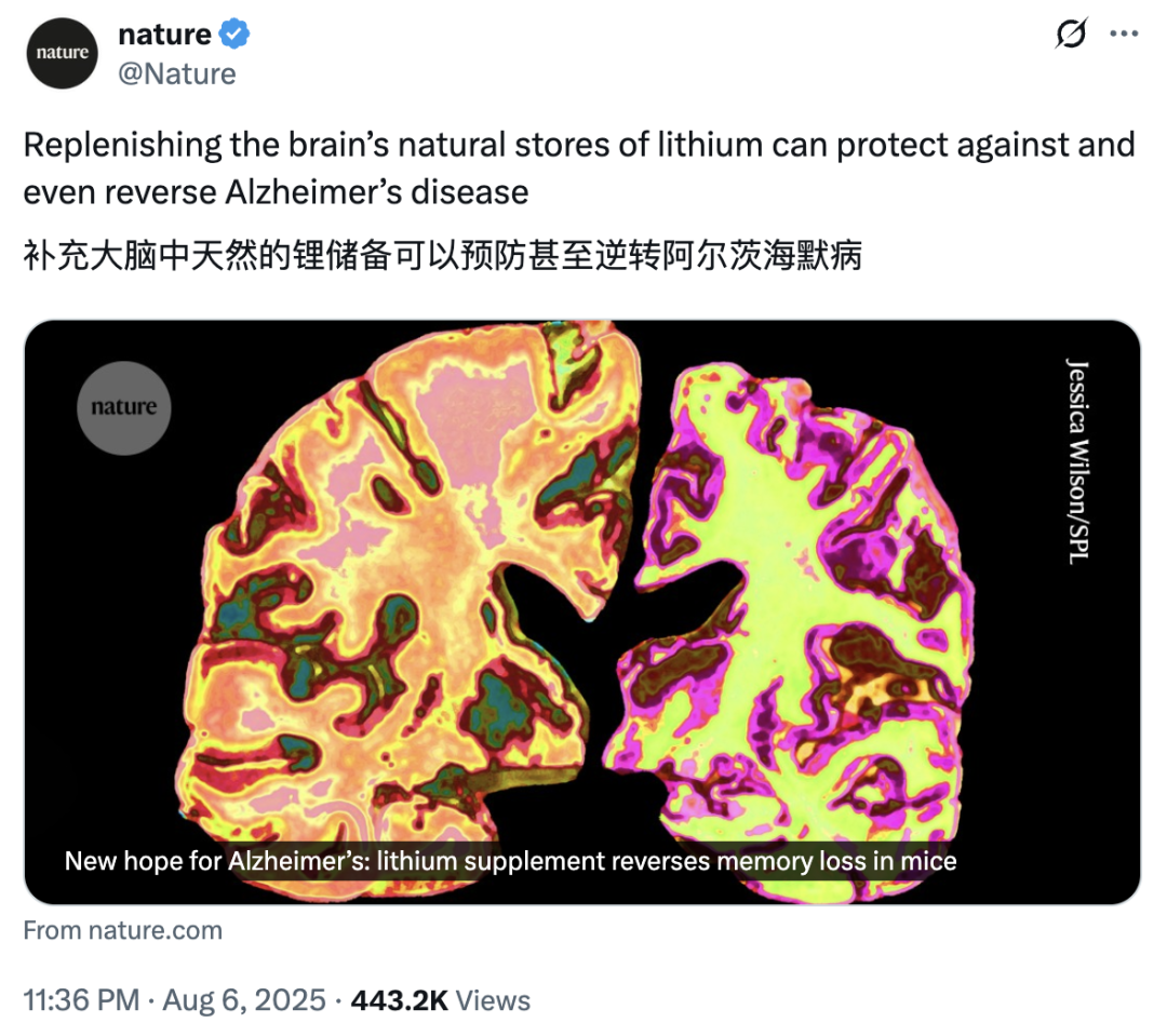 Nature最新报道:补充大脑中天然的锂储备可以预防甚至逆转阿尔茨海默病。