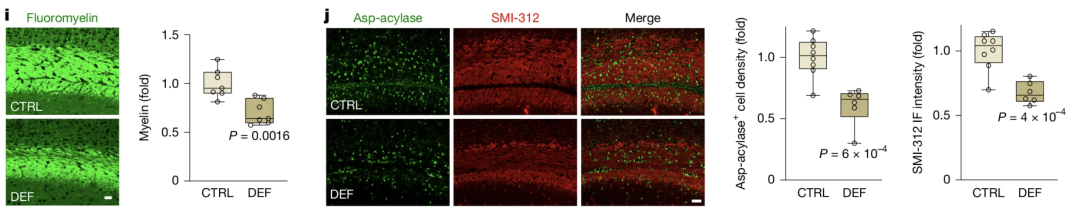 荧光髓鞘标记显示,长期锂缺乏后3xTg小鼠的髓鞘显著减少(图i)。这与锂缺乏的3xTg和野生型小鼠中少突胶质细胞、Oligodendrocyte前体细胞和轴突数量的减少有关(图j)。