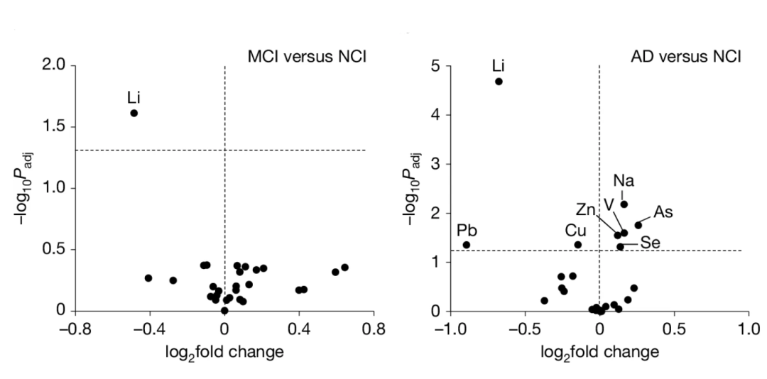 结果发现,在所有检测的金属中,仅锂(Li)在前额叶皮层中MCI和AD患者的水平显著降低。
