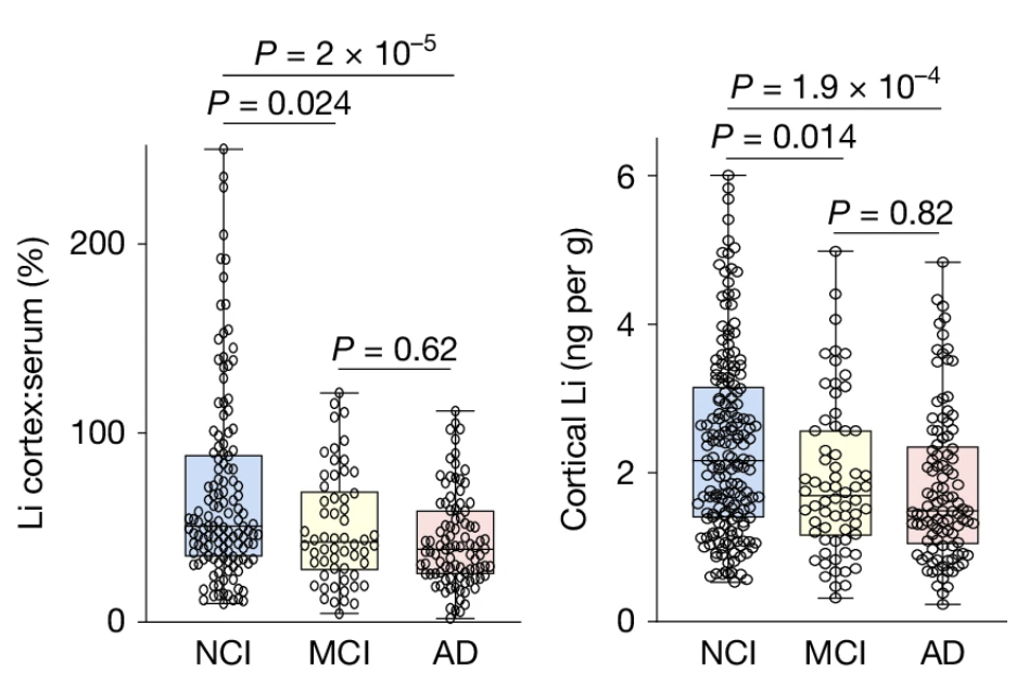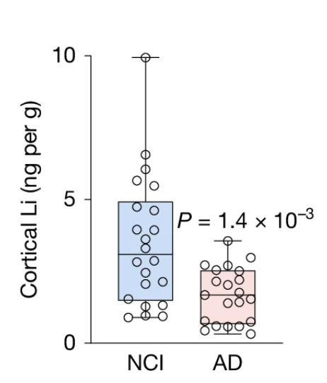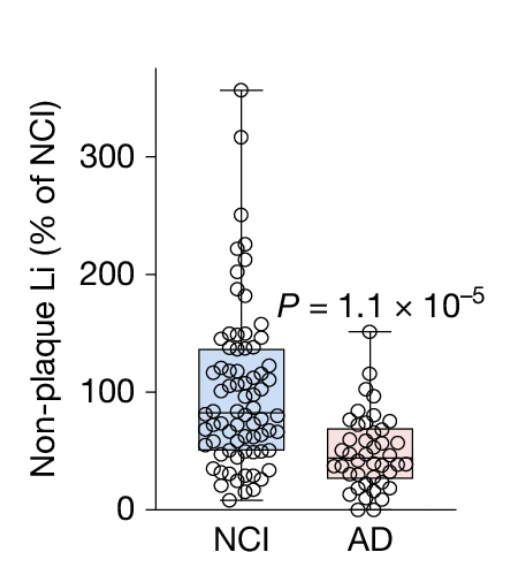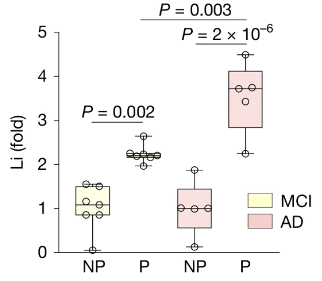在研究阿尔兹海默病(AD)的分子机理时,论文发现内源性锂(Li)在大脑中动态调节,并在衰老过程中有助于认知功能的维持,并且,锂是唯一在轻度认知障碍(MCI)患者大脑中显著减少的金属,而MCI是AD的前兆。