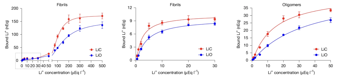 这种结合呈现饱和特性,并存在两个结合区间:高亲和力区间(0-2微当量/升)覆盖了脑组织和血清中锂的生理浓度范围;低亲和力区间则对应于临床药理剂量浓度。值得注意的是,在广谱锂浓度范围内,LiC对Aβ42纤维原和寡聚体的结合亲和力均显著高于LiO。