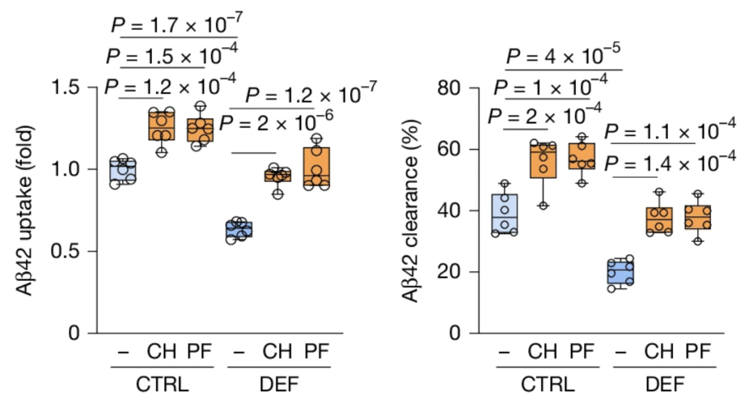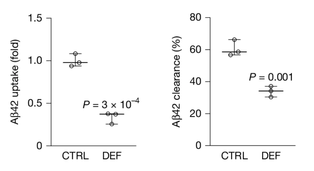 与对照组相比,来自锂缺乏野生型小鼠的小胶质细胞对Aβ42的摄取能力及其后续降解作用均显著降低。