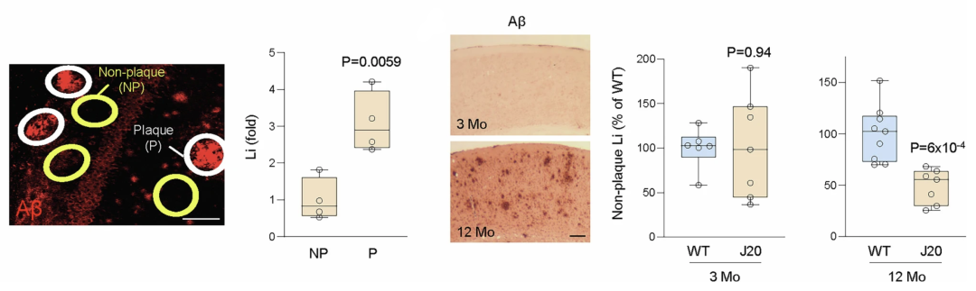 激光诱导电感耦合等离子体质谱(LA-ICP-MS)显示,12个月大的J20小鼠皮质Aβ沉积物中的锂浓度比邻近无斑块皮质区域高约3-4倍。